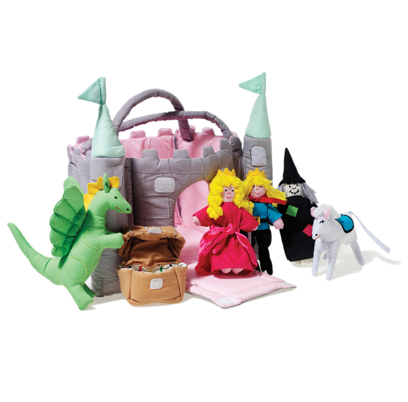 - A magical medieval castle with drawbridge and towers. The set also includes a prince, a princess, a white horse, a dragon, a witch, and a treasure chest. This toy aims to stimulate children’s imagination and role play. In total 7 pcs.