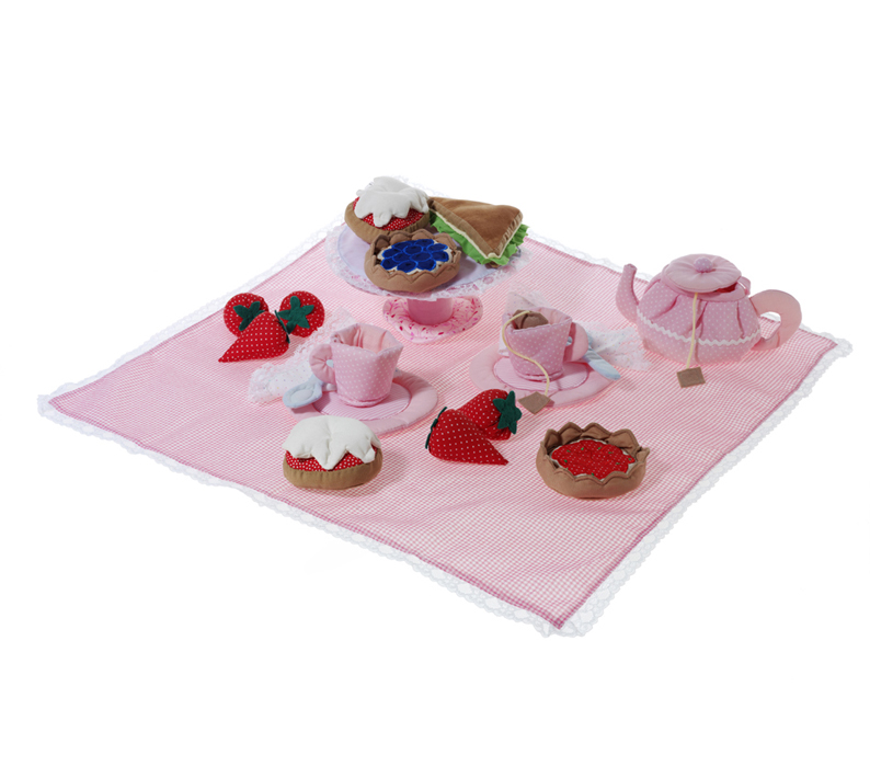 - This very pretty tea set in romantic shabby chic look has the classic accessories like scones with clotted cream, finely cut cucumber sandwich, strawberries and deliciously looking fruit tarts. The set also comes with an adorable tea pot, two cups and saucers, two teaspoons, napkins, table cloth, and a cake stand. In total 24 piece