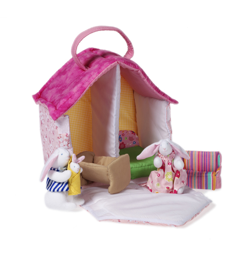 - A very sweet Bunny doll’s house with two wallpaper decorated rooms for a young little bunny family. Includes a Mummy bunny, Daddy bunny, baby bunny, bed, sofa and a little baby crib. A small handle makes it easy to bring this toy along in the car, bus etc. In total 7 pcs.