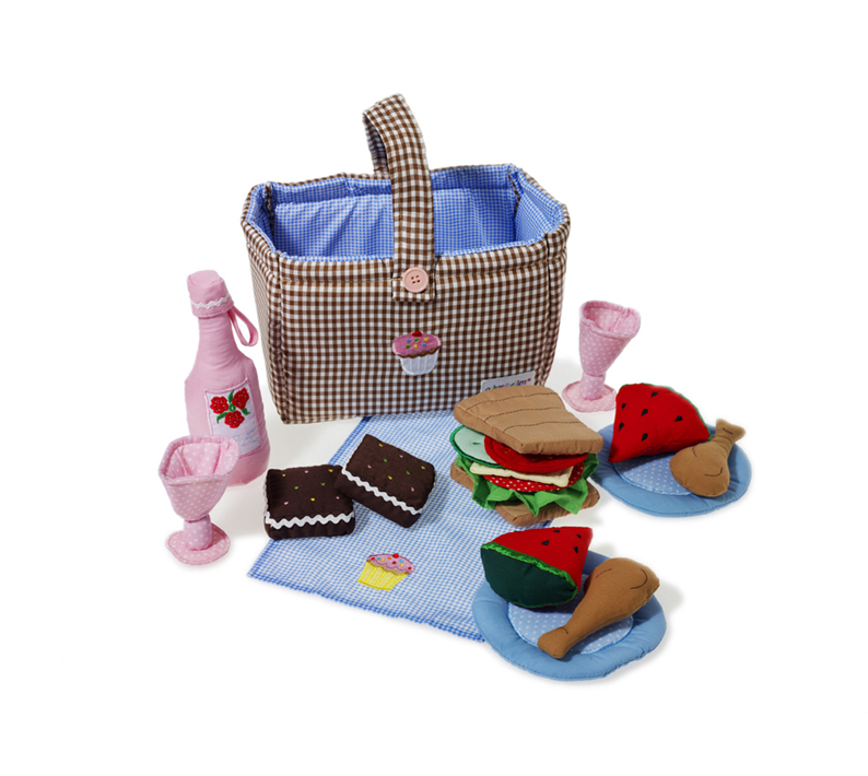 - The perfect play set to host a make-believe picnic whatever the weather or setting. Made in pretty, thick padded cotton fabrics. The adorable picnic basket is jam packed and includes; tea towel, 2 plates, 2 flute glasses, bottle of lemonade, a sandwich with various detachable fillings such as cheese, salami, lettuce, cucumber and tomato, melon slices, chicken clubs and deliciously decorated chocolate brownies – yum! In total 20 pcs
